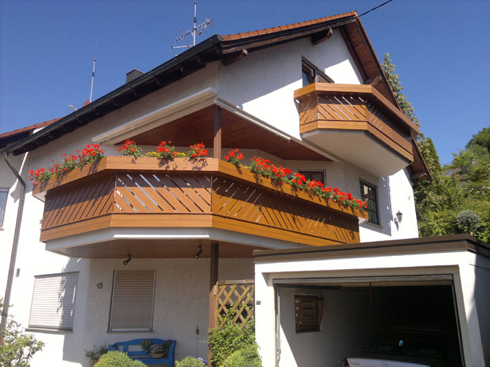 Balkongeländer mit Alubretter in Holzdekor in vielfältigen Ausführungen, waagrecht, senkrecht oder schrägverlaufend.